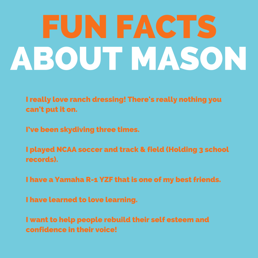 Hello, my name is Mason Stevens and I am originally from Oakdale, CA, but that does not explain who I am or where I am from. As a military kid who moved nearly every two years of my entire life, concluding with three different high schools in three different states, you could say that I was raised maybe a little different than normal. Because I was always exposed to new challenges and places, I look forward to change and working on things I am bad at instead of shying away from it. I am an advocate for learning and to never stop trying new things.